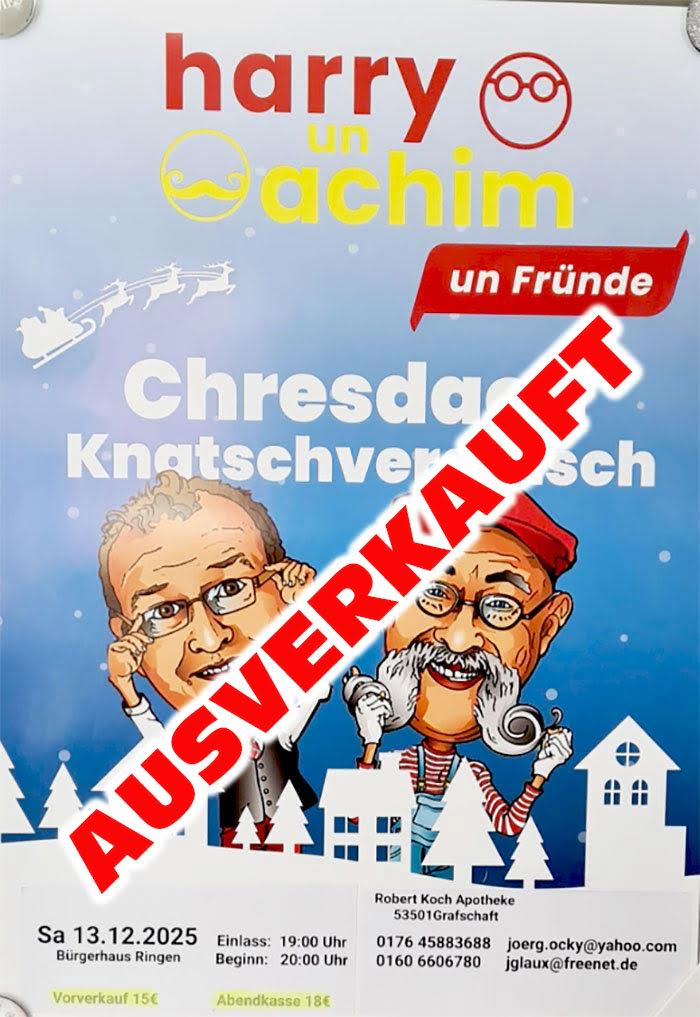 Die vor zwei Jahren von unseren Freunden vom Männerballett Ringener Perlen gestartete jecke Veranstaltung geht dieses Jahr in die zweite Runde! Das kölsche Duo Harry & Achim kommt mit einer neuen Weihnachtsshow nach Ringen. Garantiert sind jede Menge Pointen für die Lachmuskeln und die ein oder andere Überraschung. Gerne unterstützen die Wendböggele diese feucht-fröhliche Veranstaltung der Extraklasse. Jetzt gilt es, Karten zu sichern, der Vorverkauf hat bereits begonnen!
