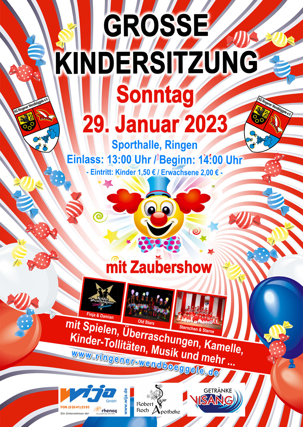 Wir laden alle Kinder und Jugendlichen mit Eltern, Großeltern und allen jung-gebliebenen Närrinnen und Narren zu unserer Großen Kindersitzung mit Spielen, Tänzen, Tollitäten, Kamelle und weiteren Überraschungen ein.